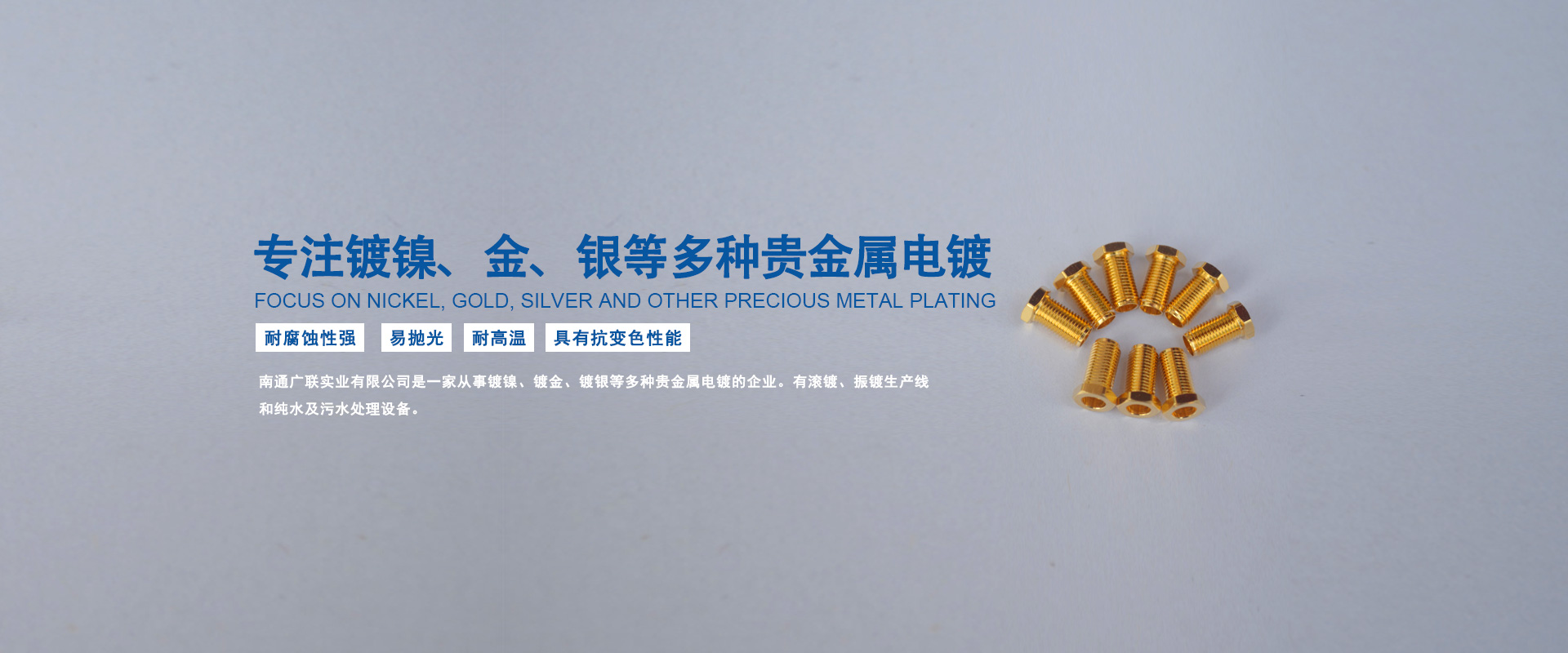 南通廣聯實業有限公司是一家從事鍍鎳、鍍金、鍍銀等多種貴金屬電鍍的企業。有滾鍍、振鍍生產線和純水及污水處理設備。